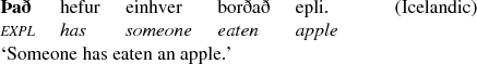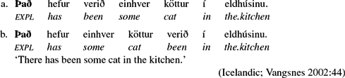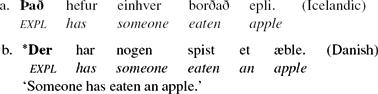 Ever since interest in comparative syntax took off in the 1980s, expletives have been a central field of research – not least owing to the considerable variation in expletive constructions in the Germanic languages. This variation is particularly evident in the Scandinavian languages; the Insular Scandinavian languages clearly differ from those of Mainland Scandinavia with respect to expletives and expletive pro. Particular attention has been paid to transitive expletive constructions, i.e. constructions containing an expletive followed by an active transitive verb. While active transitive verbs, too, can appear in expletive constructions in Icelandic (and to some extent in Faroese; see Thráinsson et al. Reference Thráinsson, Petersen, Jacobsen and Hansen2004:282), ‘the standard claim is that transitive expletives are not possible’ in the Mainland Scandinavian languages (Thráinsson Reference Thráinsson2007:336). Vikner (Reference Vikner1995) illustrates the difference between Insular and Mainland Scandinavian with the following examples: