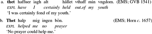 Several explanations have been offered to account for the difference between Insular and Mainland Scandinavian demonstrated in (1). Substantially, the point of departure has been conditions in the Scandinavian standard languages, and various morphological and syntactic features, such as verbal agreement and verb movement, have been proposed as licensing transitive expletive constructions, the presence or absence of these features being considered to explain why such constructions occur in Insular but not in Mainland Scandinavian. In addition to accounting for differences between Insular and Mainland Scandinavian, these proposals also have diachronic implications. Although transitive expletives are generally assumed not to exist in the present-day Mainland Scandinavian languages, the proposed licensing factors predict that they will occur in earlier stages of Mainland Scandinavian, and Holmberg & Platzack (Reference Holmberg and Platzack1995:139) show that these predictions are in fact borne out – at least in the sense that Early Modern Swedish allows such constructions:Footnote 1