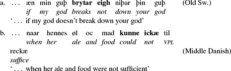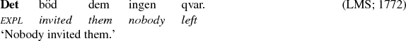 According to Falk (Reference Falk1993), V°–T° movement is triggered by verbal inflection, and she argues that V°–T° movement in subordinate clauses in Swedish finally disappears when agreement in number is lost during the 17th century. If, with Vikner (Reference Vikner1995), we assume a connection between V°–T° movement and transitive expletive constructions, we would expect the latter to occur in Swedish as long as V°–T° movement is a syntactic possibility in subordinate clauses, i.e. until the 17th century.
