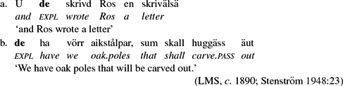 As for Late Modern Swedish, Olson (Reference Olson1913) and the Swedish Academy dictionary SAOB (1910:D824) give a few examples of expletives combined with transitive verbs (see (14) below), but according to Olson (Reference Olson1913) expletive pronouns are unusual in this context, and judging from SAOB expletive pronouns have occurred in combination with transitive verbs in Swedish, but nowadays (i.e. in 1910) they are hardly used. The latest examples given by SAOB, in (15), are from the 1840s.