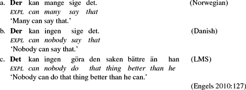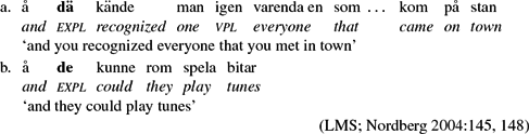 From a diachronic point of view it is interesting that, while transitive expletives still occur in Swedish, the construction is nowadays more or less confined to the spoken language. The reason for this may be puristic: transitive expletive constructions have been regarded as a result of German influence (see Beckman Reference Beckman1918, Wellander Reference Wellander1939). In written languages, certain constructions may be banned, but it is certainly more difficult to force them out of a spoken language. The fact that transitive expletive constructions are restricted to spoken Swedish, or certain varieties of it, and do not occur in the standard language, may also be a reason why they have not previously been observed in Swedish. As Hudson (Reference Hudson, Jacobs, von Stechow, Sternefeld and Vennemann1995:1518) points out, it is ‘all too easy to draw general and fundamental conclusions about the basic structure of a language on the basis of facts which turn out not to apply generally to all dialects of the same language’.
