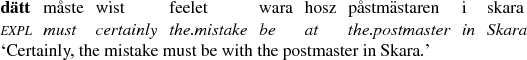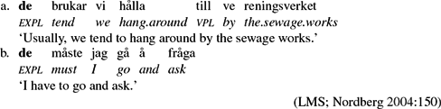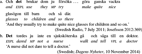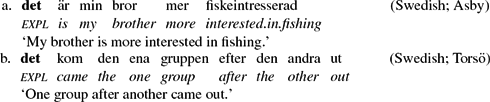 Although expletive det rarely seems to combine with definite associate subjects in written Swedish after the 18th century, Ljunggren (Reference Ljunggren1926) reports examples of the construction from the contemporary spoken language: