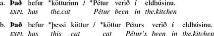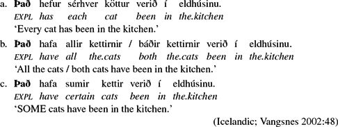 Although Icelandic has two positions for associate subjects, Vangsnes (Reference Vangsnes and Svenonius2002) shows that these different positions allow different types of nominal phrases. Much as in English and Mainland Scandinavian, associate subjects in the postverbal position in Icelandic are subject to the definiteness effect, ruling out definite descriptions (24a–b), universally quantified noun phrases (24c–d) and partitive noun phrases (24e) from this position: