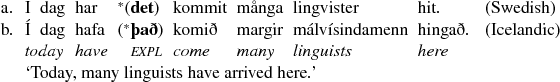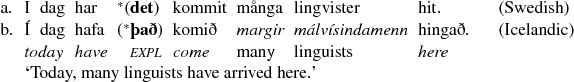 The occurrence of definite associate subjects in expletive constructions in Swedish resembles the use of topic expletives in German, as in (52) below, and clearly shows that Swedish not only has quasi-argumental and non-argumental expletives, but also a topic expletive, merged in Spec,CP.