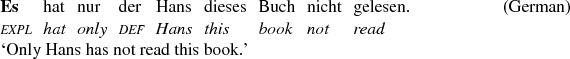 In a Scandinavian context, the term ‘transitive expletive construction’ is normally used to refer to a transitive verb in combination with an expletive pronoun and an indefinite associate subject (as in (1a) above – repeated here as (22)). However, the Swedish examples discussed in this section include a broader repertoire of associate subjects with definite associate subjects in majority. From an Icelandic point of view, this is an unexpected pattern. At the same time, it has to be emphasized that the Swedish instances of transitive expletive constructions are not unique. In German, too, active transitive verbs can combine with expletive pronouns and a definite associate, as will be further discussed in the next section.