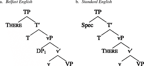 Henry & Cottell (Reference Henry and Cottell2007) argue that expletives in Belfast English are merged in a higher structural position than in Standard English, and hence there are positions available both for the expletive and the associate subject in Belfast English, but not in Standard English:Footnote 11