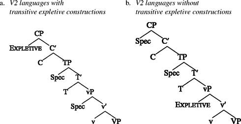If the analysis suggested by Henry & Cottell (Reference Henry and Cottell2007) were to be applied to V2 languages, it might be proposed that the expletive merges in Spec,CP in languages allowing transitive expletive constructions, but in Spec,vP in languages in which such constructions are not allowed. See (32a) and (32b):