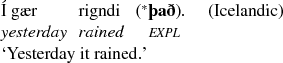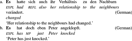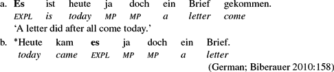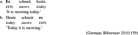 A common way of handling the difference between Mainland and Insular Scandinavian illustrated in (33) is to assume that the expletive in Icelandic is some sort of a placeholder, merged in a different position than expletive subjects in Mainland Scandinavian. Biberauer (Reference Biberauer, Biberauer, Holmberg, Roberts and Sheehan2010) has argued that, in the Scandinavian languages, expletives are merged either in Spec,CP (Icelandic) or in a lower structural position (Mainland Scandinavian), but she suggests that there are languages, such as German and Dutch, where they can merge in either the higher or the lower structural position. For German, Biberauer (Reference Biberauer, Biberauer, Holmberg, Roberts and Sheehan2010) points to the fact that quasi-arguments can occur to both the left and the right of the finite verb (see (34)), whereas non-argumental expletives are never overtly realized to the right of the finite verb, as shown in (35).Footnote 12