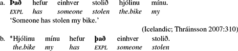 Bobaljik & Thráinsson (Reference Bobaljik and Thráinsson1998) argue that the (standard) Mainland Scandinavian languages have a negative value for the split-IP parameter, and that this negative value is the reason for the lack of transitive expletive constructions in Danish, Norwegian and Swedish: given that the associate of the expletive has to leave VP, there is no position available for it in the T-domain, since this position is already occupied by the expletive. In Icelandic on the other hand, the split-IP parameter has a positive value and from this it follows that transitive expletive constructions occur: even if the expletive occupies a position in the T-domain, there is still a position available for its associate. As in much of the generative syntactic research of the 1990s, Bobaljik & Thráinsson (Reference Bobaljik and Thráinsson1998) assume a relationship between overt morphology and parameter setting, and as far as the split-IP parameter is concerned, the expression of both tense and agreement by discrete morphemes (as Icelandic kasta-ði-r ‘throw-past-sg.2’ or köstu-ðu-m ‘throw-past-pl.1’) results in a positive value of the parameter.