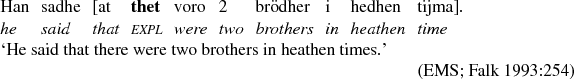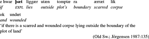 In subordinate clauses where topicalization is more or less ruled out, however, there are very few instances of expletive det. According to Falk (Reference Falk1993:254) ‘[s]ome examples’ can be found, but in Old Swedish we are aware of only one (Jörgensen Reference Jörgensen1987:135):