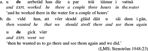 Ljunggren (Reference Ljunggren1926) gives many examples of transitive verbs with expletive pronouns, but it is not clear whether this usage was widespread in contemporary spoken Swedish or restricted to particular dialects. According to Heinerz (Reference Heinerz1930), transitive expletive constructions were unattested in the Scanian dialects, and Wallin (Reference Wallin1936) argues that they mainly occur in south-western Swedish. However, Stenström (Reference Stenström1948) shows that such constructions occur in the traditional dialect of Gotland (see (18) below), while Nordberg (Reference Nordberg, Bäcklund, Börestam and Marttala2004) reports examples from the spoken language of central Sweden, used by informants born around the turn of the past century (see (19)). Overall, there seems to be good reason to believe that, around 1900, expletive pronouns could combine with active transitive verbs in spoken Swedish – completely independently of licensing factors such as verbal agreement and verb movement.