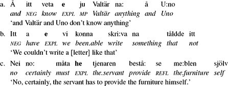 Interestingly, however, although transitive expletive constructions occur rather sparingly in the written language throughout the history of Swedish, Ljunggren (Reference Ljunggren1926) reports that they were frequently attested in spoken Swedish around 1900. Some of his examples are given in (16)–(17):