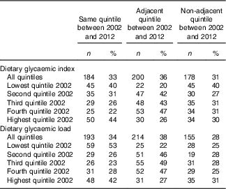 Table 3 presents the cross-classification between 2002 and 2012 for GI and GL. For GI, 33 % of the participants were in the same quintile between 2002 and 2012, and 31 % moved to a non-adjacent quintile. For GL, this was 34 and 28 %, respectively. The lowest and the highest quintiles of GI were the most stable, with 40 and 44 % of the participants staying in the same quintile. This was only 22 % for the fourth quintile. The same tendency was present for GL – that is, the most extreme quintiles were the most stable.