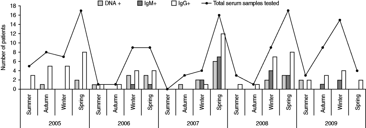 Fig. 1. Markers of infection and immunity for parvovirus B19 (DNA, IgM, IgG) by season and year, in patients with febrile exanthema.