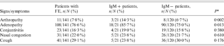 Table 1. Clinical features in patients with febrile exanthema (FE) divided into patients with recent or active acute infection by parvovirus B19 (IgM+) and IgM− patients