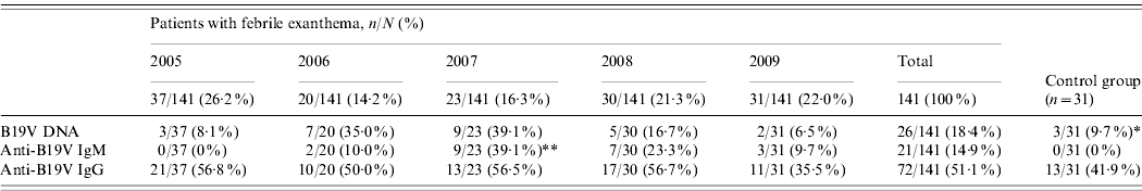 Table 2. Prevalence of markers of infection and immunity for parvovirus B19 (DNA, IgM, IgG), in the group of patients with febrile exanthema, 2005–2009, and in the control group