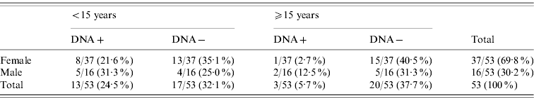The age range of patients positive for anti-B19V IgM (IgM+) was 2 months to 37 years. Only 10/21 (47·6%) IgM+ specimens had an associated positive determination of viral DNA (DNA+), while 19/21 (90·5%) of the IgM+ specimens were also positive for B19V-specific IgG (IgG+). On the other hand, B19V DNA was found in 16/53 (30·2%) of the specimens that were IgM−/IgG+ (immune patients). In these immune patients B19V DNA was significantly more frequently associated with children aged <15 years (P<0·001) and in male patients (P<0·001), as shown in Table 3.