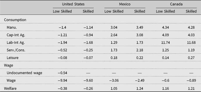An important feature of the general equilibrium model is the capability to analyze the indirect impacts of trade policies on undocumented and domestic labor markets. As elaborated previously, total U.S. production in the two sectors (labor-intensive agriculture and service and construction) that hire undocumented workers falls, causing demand for and the wage rate of undocumented workers to decline. Furthermore, the expansion of Mexican production in each sector increases labor demand, which puts upward pressure on Mexican wages and incentivizes low-skilled Mexican workers to remain in Mexico as opposed to entering the United States illegally and undocumented workers residing in the United States to return to Mexico. The combined effect of lower demand for and wage rate of undocumented workers in the United States and higher labor demand in Mexico is that the number of undocumented workers residing in the United States declines (–2.62% for labor-intensive agriculture and –9.23% for service and construction;Footnote 15 see Table 4).