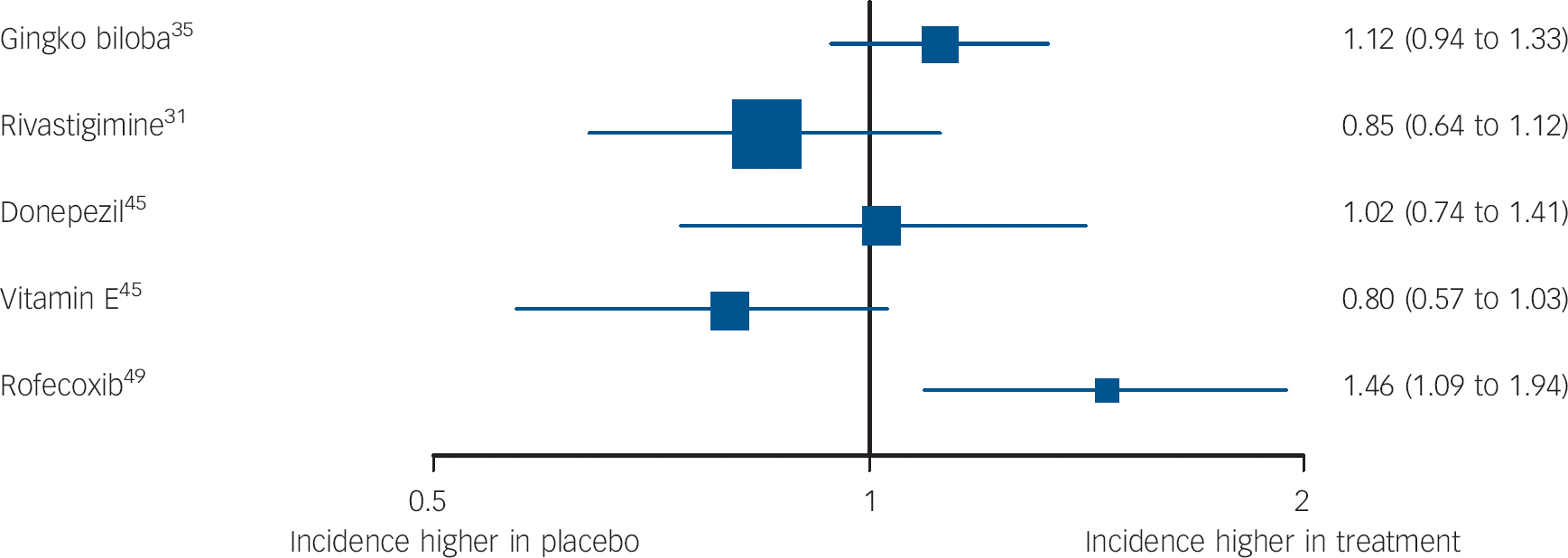 Non-steroidal anti-inflammatory drugs reduce brain neurotoxic inflammatory responses, so could improve cognition. Reference Weggen, Eriksen, Das, Sagi, Wang and Pietrzik58 Thal et al, Reference Thal, Ferris, Kirby, Block, Lines and Yuen49 in a very high-quality large study (validity score: 5), found significantly more incident cases of Alzheimer's disease over 4 years in participants randomised to 25 mg daily of rofecoxib (a COX-2 inhibitor) than those taking placebo (Fig. 4). There was no significant difference between groups on secondary outcomes. In 2003, rofecoxib was withdrawn due to cerebrovascular and cardiovascular side-effects.