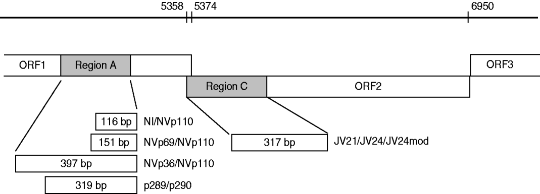Fig. 1. Schematic presentation of norovirus genomic regions A and C (grey) [Reference Vinje, Hamidjaja and Sobsey17], and RT–PCR primers (NI/NVp69/NVp36/NVp110, p289H,I,IUB/p290H,I,J,K,IUB and JV21/JV24/JV24mod, described in the Methods section) used for reverse transcriptase (RT)–PCR and genotyping. Numbers on the bar refer to the nucleotide positions in Norwalk GI.1 virus genome (GenBank accession no. M87661). RT–PCR amplicon sizes in base pairs are noted in the boxes.