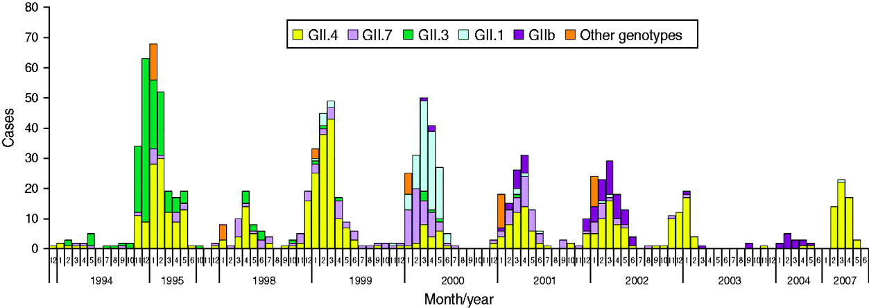 A total of 4727 faecal specimens from AGE cases were studied and 1172 (25%) cases were found to be associated with NoVs, as determined by genotyping according to region A sequences (Table 1). NoV genotypes during the period 1994–2007 by month are shown in Figure 2. The study period covered ten seasons with each season starting in July and ending in June. Of the 1149 genotyped NoV strains, 96% were genogroup GII. GII.4 was the most common genotype throughout the study period (46%), but it appeared in varying proportions in the NoV epidemic seasons (Fig. 2, Table 2). GII.4 was already present in community-acquired cases in 1993–1994 with a 40% share, but dominated in the seasons 1998–1999, 2002–2003 and 2006–2007 (Table 2, values in bold face).