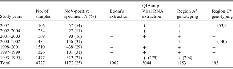 Table 1. Study specimens analysed and the methods used for RNA extraction and NoV genotyping 1993–2007