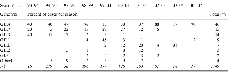 Additional NoV genotypes detected are listed in Table 2. Other genotypes included: GI.6, GI.4, GII.9, GI.2, GIIU, GIId which accounted for <1% each (Fig. 2, Table 2). During the seasons 1999–2000 and 2003–2004, which followed the GII.4 peak seasons, the shares of GII.4 were low (13% and 17%, respectively), and genotypes GII.1, GII.7 and GII.b dominated. In the early study years GII.4 was circulating with GII.3 (1994–1998) and with GII.7 (1994–2002), followed by GII.1 (1999–2000) and GII.b in the later seasons (2000–2007). Overall, of the total ten study seasons GII.4 predominated in seven seasons, while other genotypes predominated only in one season each (Fig. 2, Table 2).
