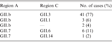 To confirm whether genotyping by capsid region C would identify identical genotypes as determined by polymerase region A, some of the specimens (years 2000–2002 and 2007, n=193) were genotyped for both of these regions (Fig. 1, Table 1). Identical genotyping results were obtained for both regions in all cases, except for the recombinant strains. Altogether 53 recombinant strains were found in 193 double genotyped NoVs in 2001–2002. No recombinant strains were found in 2007, when GII.4 was detected almost exclusively (Tables 1 and 3). RNA polymerase genotype GII.b occurred most commonly with capsid genotype GII.3 (41 cases, 77%) and rarely with GII.1 (three cases, 6%). Polymerase type GII.7 occurred with capsid genotype GII.6 (six cases, 11%) and GII.14 (one case, 2%) (Table 3).