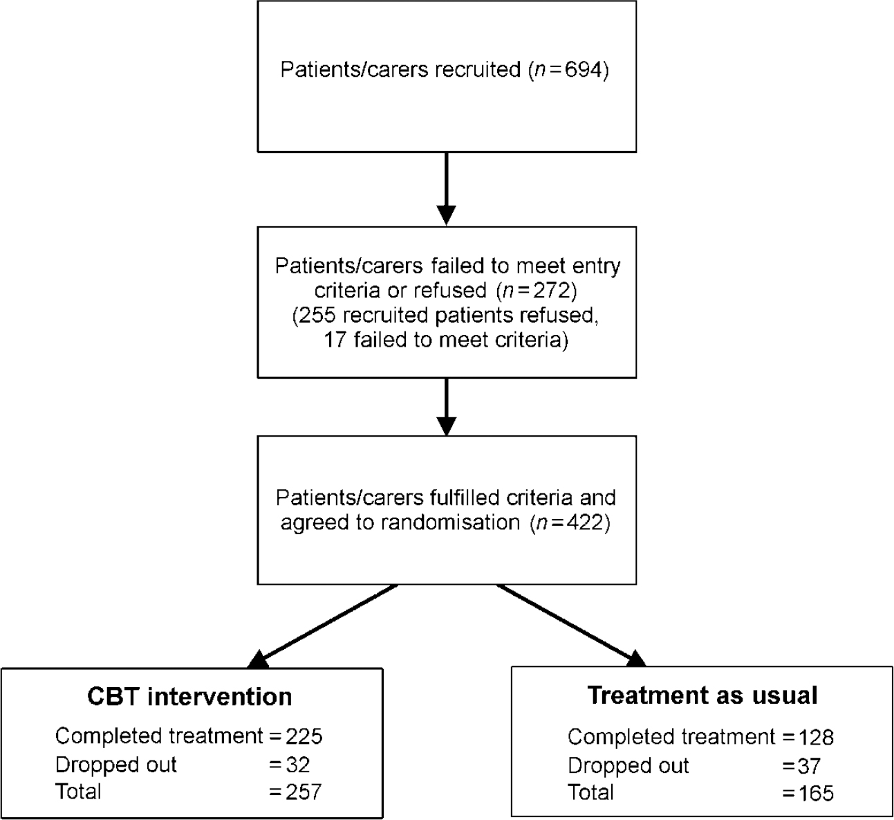 The patients and carers randomised to receive treatment as usual were left to the care of their own community mental health teams but were aware that CBT would be offered at the end of the study period. All assessments carried out in the intervention group were also completed in this group.