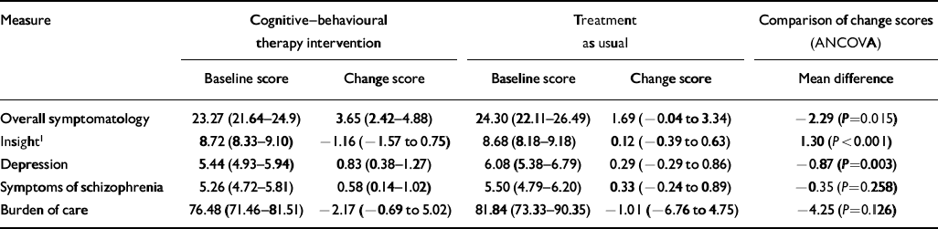 | Measure | Cognitive—behavioural therapy intervention | Treatment as usual | Comparison of change scores (ANCOVA) | ||