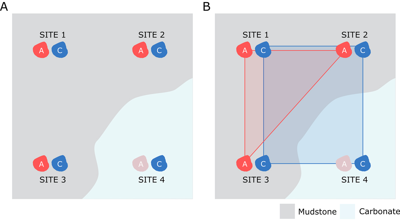 Figure 3. Diagram showing potential model of apparent range-size reduction due to spatially variable aragonite preservation. Assuming that calcitic and aragonitic species of bivalve were both living at four separate localities, but aragonitic dissolution strongly influenced one of those locations (A), the resulting convex hull for the aragonitic fauna drawn from surviving fossil occurrences would likely be smaller than that for the calcitic organisms (B).