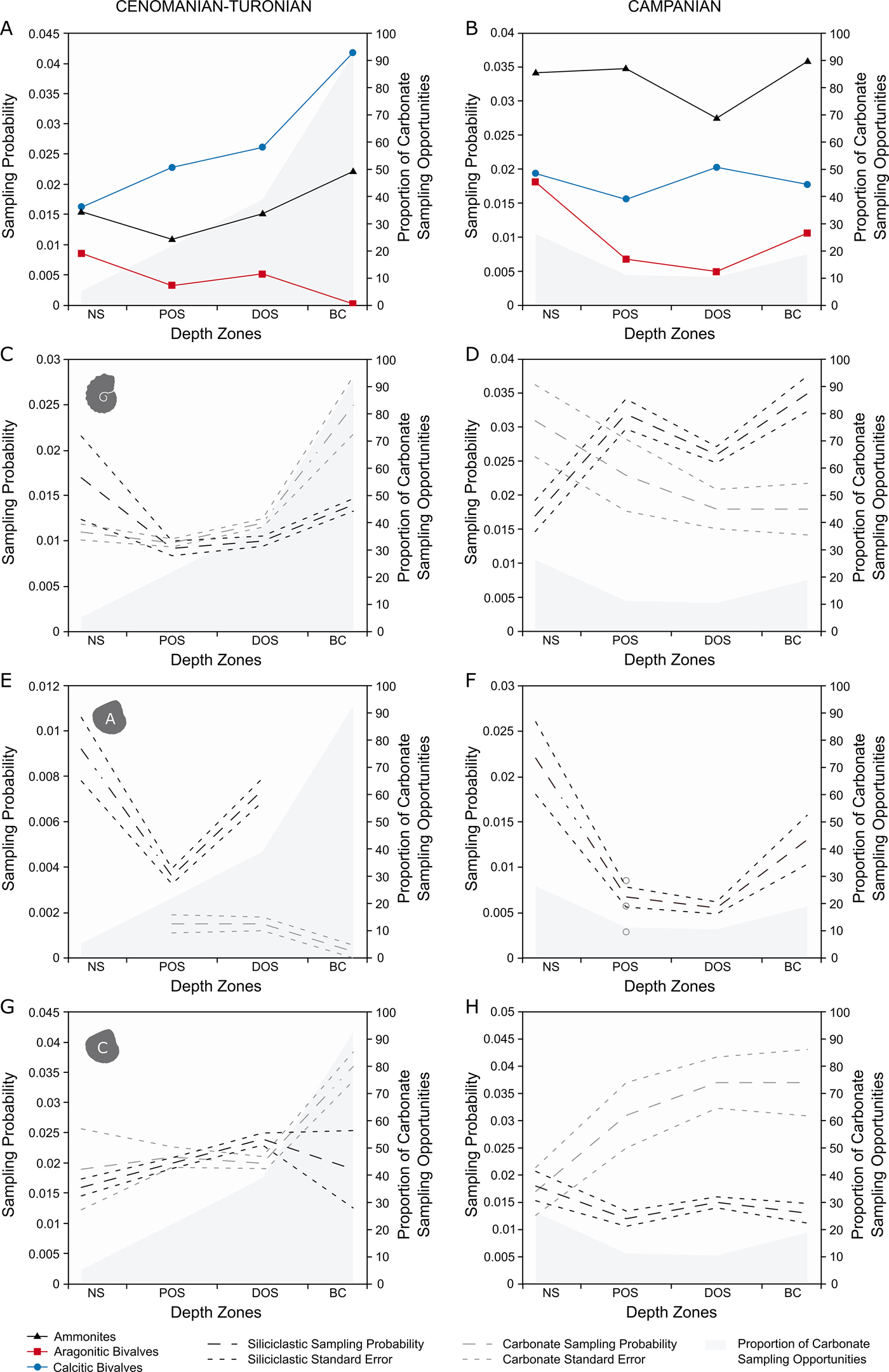 Figure 4. Plots of generic-level M2 sampling probabilities for the Cenomanian–Turonian (A, C, E, G) and lower Campanian (B, D, F, H) time slices across depth zones, split into carbonate and siliciclastic sampling opportunities. All results are plotted with percentage of carbonate collections per depth zone. A, Cenomanian–Turonian generic-level sampling probability, plotted with percentage of carbonate collections per depth zone; B, lower Campanian generic-level sampling probability, plotted with percentage of carbonate collections per depth zone; C, Cenomanian–Turonian ammonite sampling probability; D, lower Campanian ammonite sampling probability; E, Cenomanian–Turonian aragonitic bivalve sampling probability; F, lower Campanian aragonitic bivalve sampling probability; G, Cenomanian–Turonian calcitic bivalve sampling probability; H, lower Campanian calcitic bivalve sampling probability.