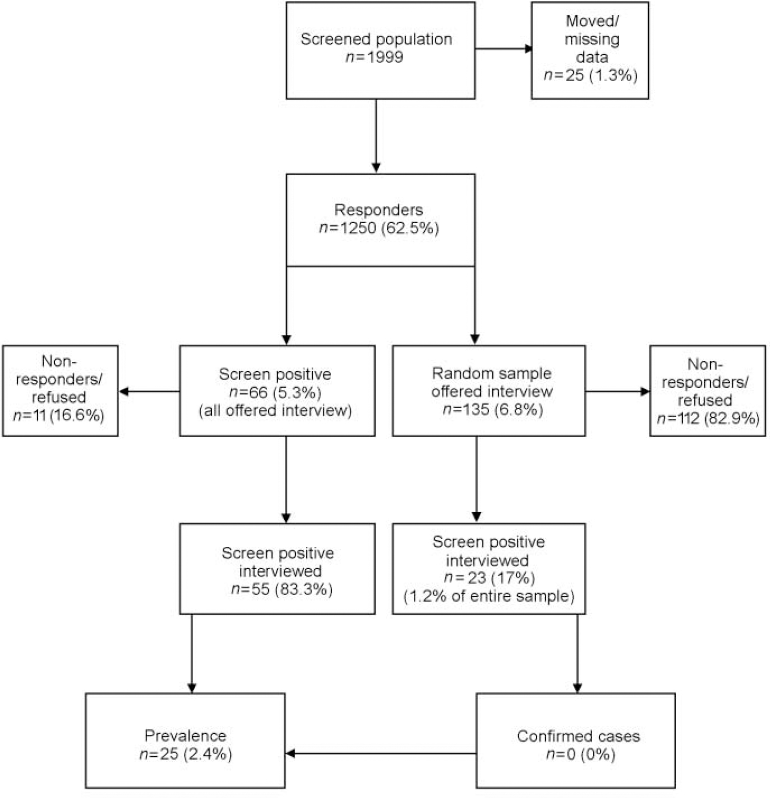 Sixty-six respondents (5.3%) screened positive for SAD according to SPAQ criteria. Fifty-five (83%) of this sample agreed to undergo diagnostic interview and 25 were diagnosed with SAD according to the outlined criteria. The statistical package STATA-5 (StataCorp, 1997) was used to calculate a prevalence rate of 2.4% (s.e.= 0.7, 95% CI 1.4-4.3) for SAD (see Fig. 1).