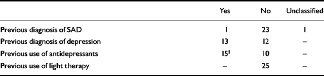 Table 1 Diagnostic and treatment history of patients with seasonal affective disorder (SAD) (n=25)