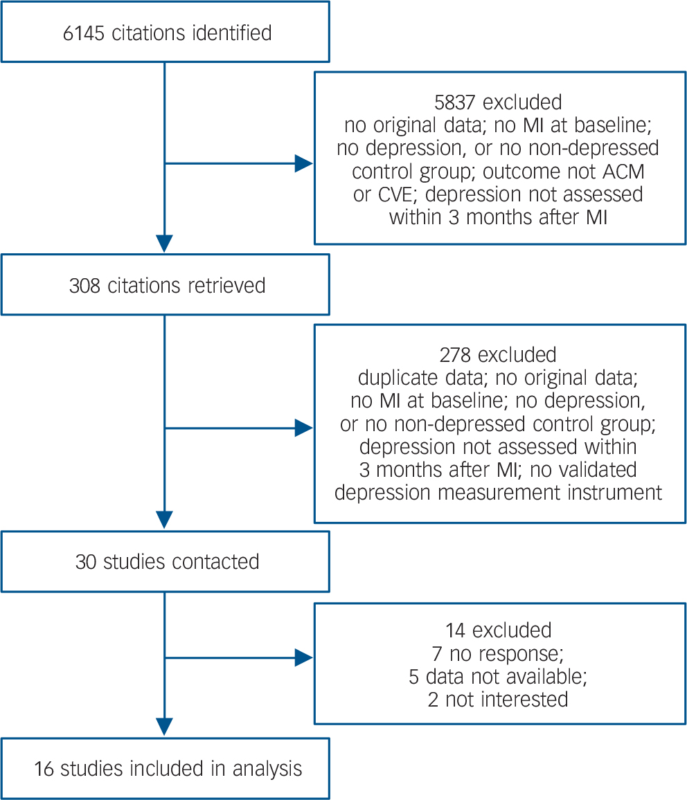 Following myocardial infarction the prevalence of major depressive disorder or elevated depressive symptoms is relatively high, at approximately 20%, Reference Thombs, Bass, Ford, Stewart, Tsilidis and Patel1 compared with around 5% in otherwise healthy people of comparable age. Reference Beekman, Copeland and Prince2 Elevated symptoms of depression, as measured with symptom questionnaires such as the Beck Depression Inventory (BDI), are present in around 30% of patients with myocardial infarction. Reference Thombs, Bass, Ford, Stewart, Tsilidis and Patel1 Post-infarction depression has been associated with a worse prognosis, and investigations into the strength of this association have been summarised in a number of meta-analyses, which showed that after myocardial infarction patients with depression were 1.59-2.71 times more likely to die early or have a new cardiovascular event than patients without depression. Reference Barth, Schumacher and Herrmann-Lingen3-Reference Meijer, Conradi, Bos, Thombs, van Melle and de Jonge5 Such meta-analyses based on summary data, however, have serious limitations. By conducting an individual patient data (IPD) meta-analysis, a new statistical approach in this field, the main limitations can be overcome.