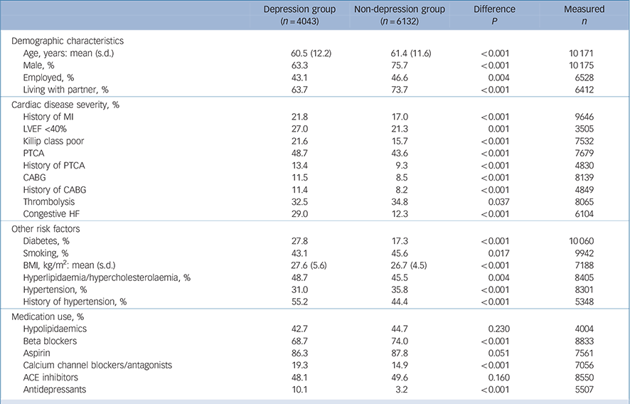Individual patient data were combined for 10 175 persons with myocardial infarction; of these, 4043 (40%) had major depression or elevated symptoms of depression and 6132 (60%) were not depressed (note that some studies may have oversampled patients with depression, so these numbers may overrepresent depression percentages). Nineteen per cent of patients had a history of one or more myocardial infarctions prior to the index episode, 23% had low LVEF and 18% had a Killip class higher than I. Twenty-one per cent of those measured had comorbid diabetes, 45% were (ever) smokers and the mean BMI was 27 kg/m2 (Table 1).