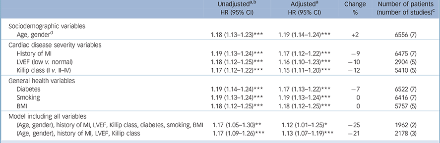 Individual studies find conflicting results when the association between post-infarction depression and prognosis is adjusted for disease severity, some finding it to be attenuated, whereas others concluded the association remains unchanged. Previous systematic reviews and meta-analyses were only able to provide estimates of unadjusted associations, or very limited estimates of adjusted associations. This is due to the wide variability of adjustments in individual studies, making comparisons across studies impossible. Investigating the effects of adjustment is important, however, as variables related to cardiac disease severity, Reference Carney, Blumenthal, Catellier, Freedland, Berkman and Watkins15-Reference Parashar, Rumsfeld, Spertus, Reid, Wenger and Krumholz17 and other health-related variables, Reference Golden, Lazo, Carnethon, Bertoni, Schreiner and Diez Roux13,Reference Anda, Williamson, Escobedo, Mast, Giovino and Remington14,Reference Lee, Woodlief, Topol, Weaver, Betriu and Col18-Reference Denollet, Martens, Smith and Burg20 are prognostic factors for all-cause mortality and cardiovascular events, and are associated with depression.
