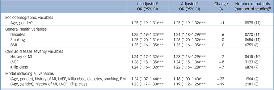 Multivariable logistic model. When all variables were added to the model at once, 3 studies and 2225 patients remained, and the adjusted OR for depression was 1.24 per s.d. (95% CI 1.07-1.44, P<0.001) in the all-cause mortality model. The added variables explained 30% of the association between post-infarction depression and all-cause mortality. When including the variables relating to cardiac disease severity only (history of myocardial infarction, LVEF and Killip class) the OR was 1.27 per s.d. (95% CI 1.17-1.37, P<0.001). These variables explained 25% of the association (Table 4).