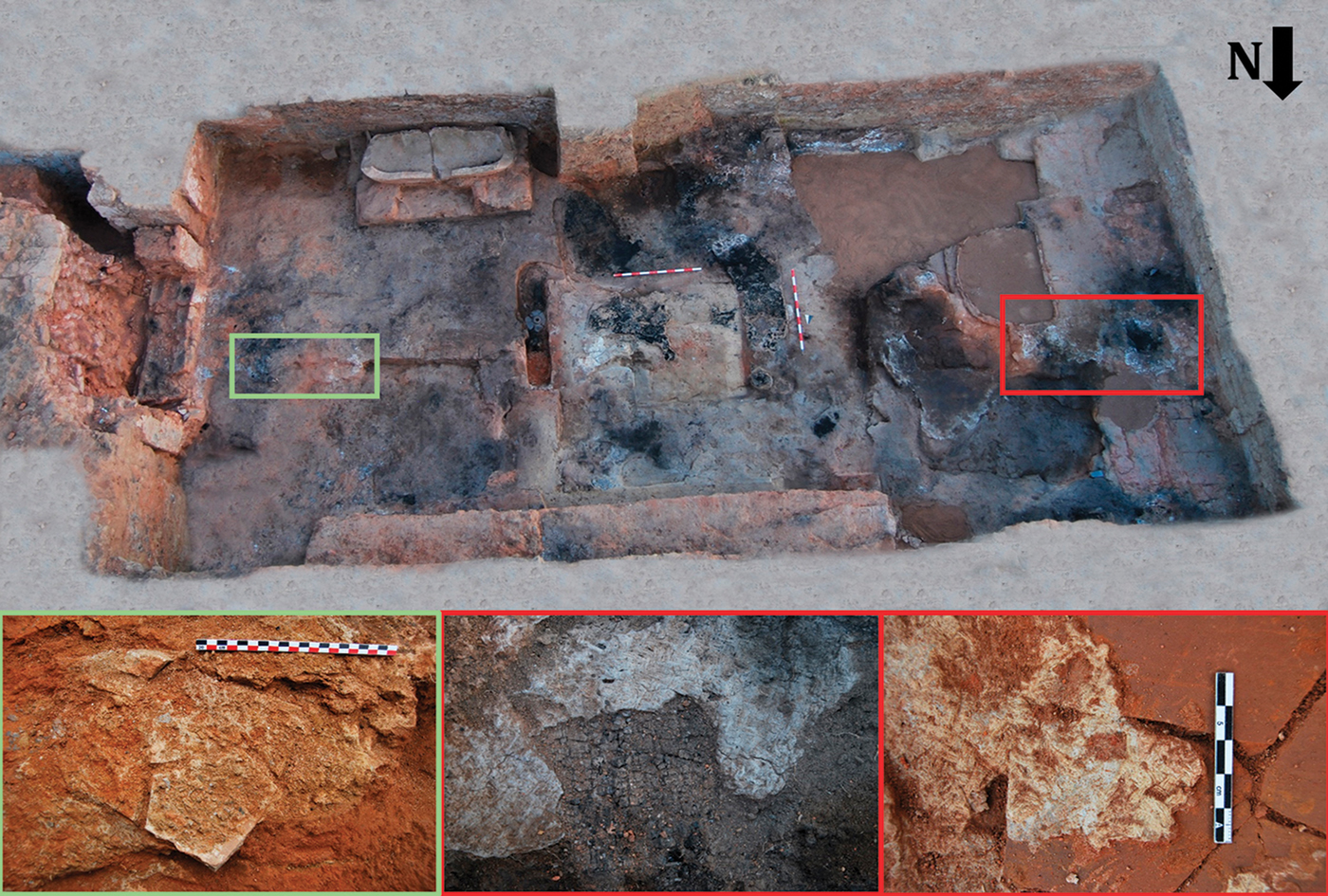 Figure 4. Views of the lower floor; findspots of textiles and fibres near the monumental staircase are indicated on the left, with a close-up of the area on the right (figure by E. Rodríguez).
