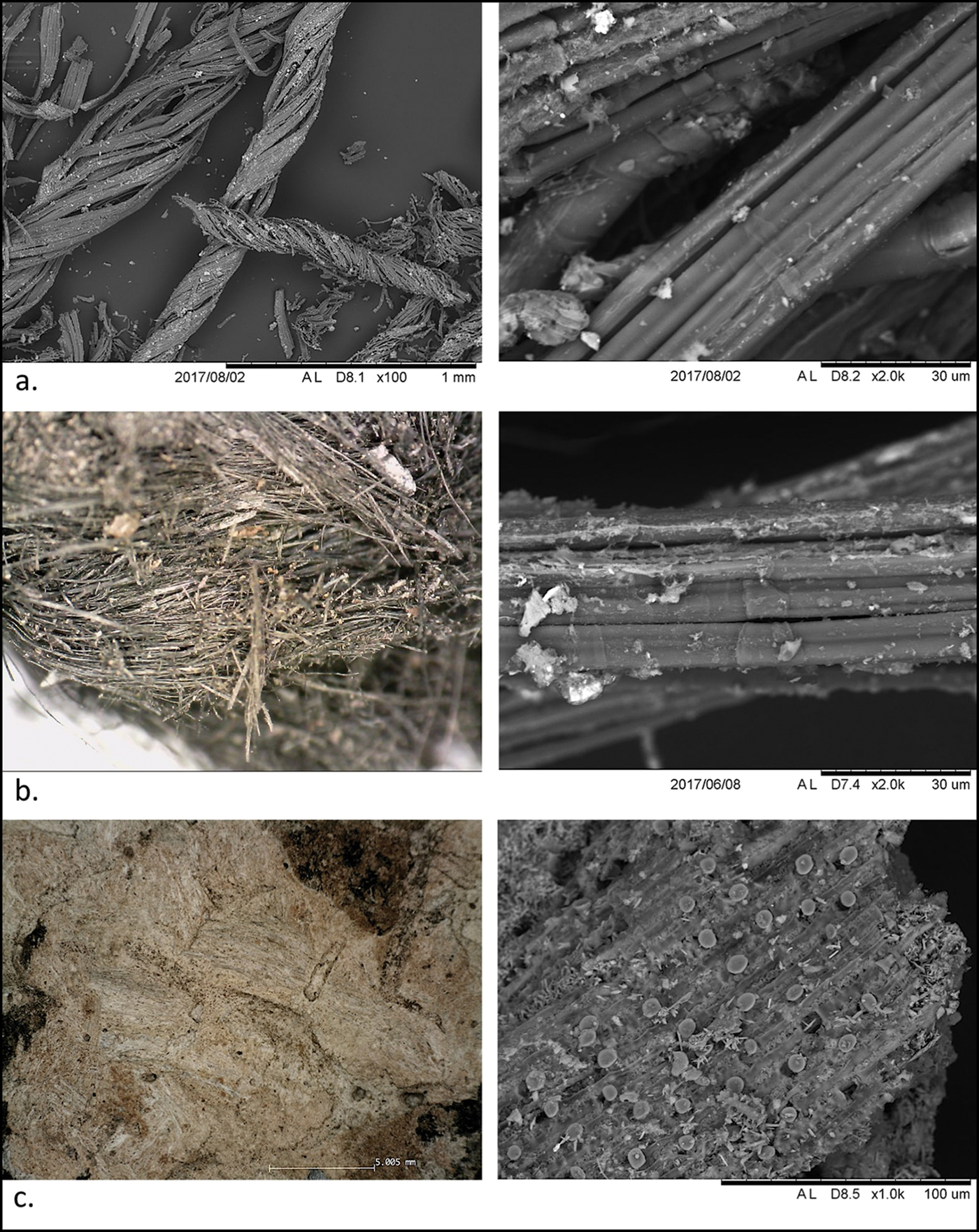 Figure 6. Digital and scanning electron micrographs of threads and fibres found at Casas del Turuñuelo: a) spliced linen threads from UE 606; b) flax fibre bundles from UE 606; c) esparto grass from UE 112 (figure by M. Gleba & B. Marín-Aguilera).