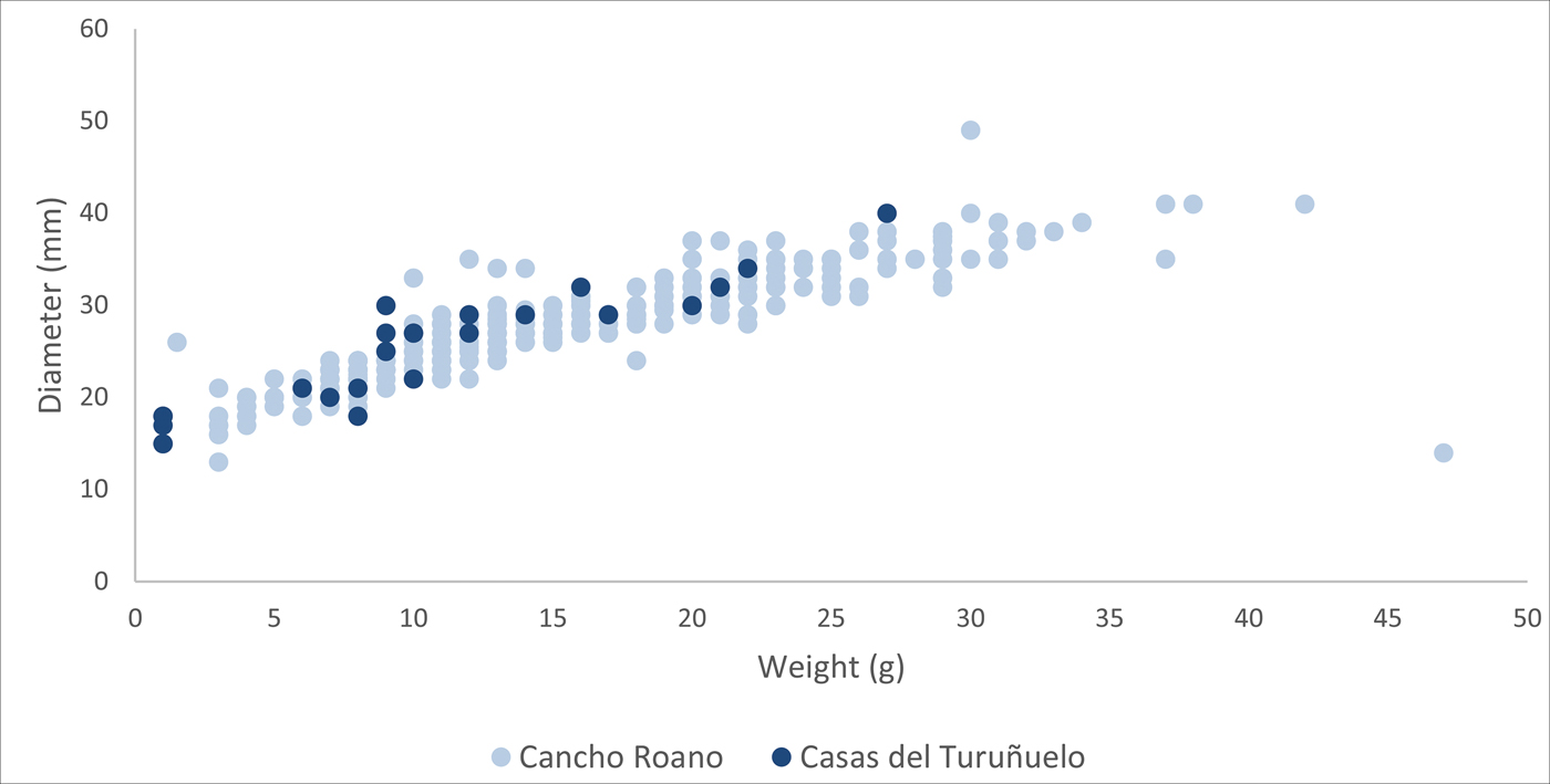 Figure 9. Scatter plot of spindle whorls from Casas del Turuñuelo (with Cancho Roano spindle whorls for comparison) (figure by B. Marín-Aguilera).
