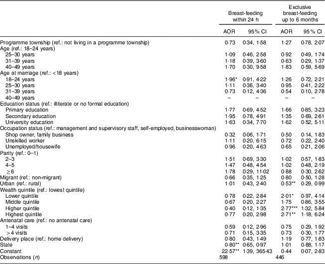 Multivariate logistic regression analyses were conducted to assess the statistical significance of differences in rates of breast-feeding within 24 h and exclusive breast-feeding up to 6 months between programme and non-programme townships. Table 3 describes the results of multivariate logistic regression models controlling for demographic characteristics, socio-economic status, migration status and maternal health services utilization. There was no difference in breast-feeding within 24 h between programme and non-programm townships after controlling for potential confounders. Age at marriage was found to be associated with breast-feeding within 24 h. Women who got married between 18 and 24 years of age were more likely to breast-feed within 24 h than those who got married at <18 years old (adjusted OR (AOR)=1·96, P<0·1). Looking at exclusive breast-feeding, no difference was seen between programme and non-programme townships after controlling for potential confounders. Urban mothers were less likely to exclusively breast-feed their baby up to 6 months (AOR=0·53, P<0·05) compared with rural mothers. Wealth quintile was also associated with exclusive breast-feeding up to 6 months, as women in higher wealth quintiles were more likely to exclusively breast-feed up to 6 months compared with those in the lowest quintile (lower quintile, AOR=2·01, P<0·1; higher quintile, AOR=2·77, P<0·001; highest quintile, AOR=2·71, P<0·05).