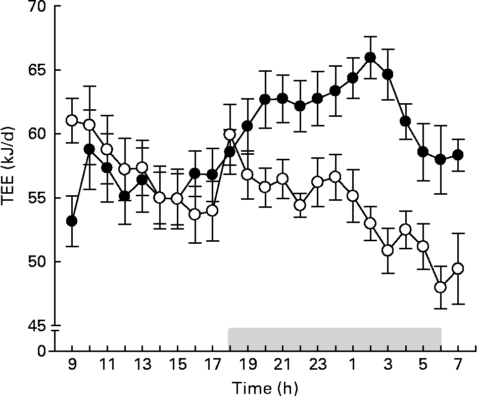 Fig. 2 Twenty-three-hour total energy expenditure (TEE) of conventional (●) and germ-free (○) mice after 4 weeks on the semi-synthetic high-fat diet. The grey bar indicates night time (lights off). Values are means with their standard errors (n 7). For statistical analysis, see Table 2.