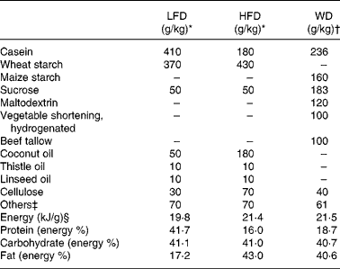 Table 1 Composition of the semi-synthetic diets (low-fat diet (LFD) and high-fat diet (HFD)) and the commercial Western diet (WD)