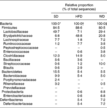 Feeding the mice a HFD led to a dramatic reduction in microbial diversity and simultaneously to an increase in one subgroup of the Firmicutes referred to as Mollicutes(Reference Turnbaugh, Backhed and Fulton23). Our sequencing data revealed a three- and sevenfold higher proportion of Erysipelotrichaceae in mice fed the WD and the HFD, respectively, compared with mice fed the SD (Table 5). Our re-analysis of the 16S rRNA sequences provided by Turnbaugh et al. (Reference Turnbaugh, Backhed and Fulton23) revealed that the majority of sequences referred to as Mollicutes belong to the Erysipelotrichaceae. The exact role of this bacterial group in host energy metabolism is still obscure, and deserves further research.