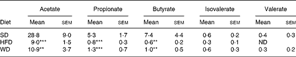 Table 6 Mean faecal SCFA concentrations (μmol/g wet faeces) of conventional mice (n 5) of Expt 3 in response to different diets (standard chow diet (SD), high-fat diet (HFD) and Western diet (WD)) after 3 weeks of diet consumption