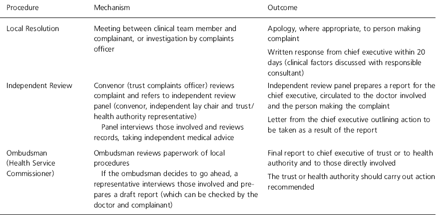 The purpose of the complaints procedure is to identify and address deficiencies in the service provided by the NHS. In this it is quite distinct from NHS or GMC disciplinary procedures, which aim to identify problematic behaviour or working practices in the individual clinician. There are three levels of investigating a complaint: local resolution, independent review and the ombudsman (Reference HoyteHoyte, 1996) (see Table 1).