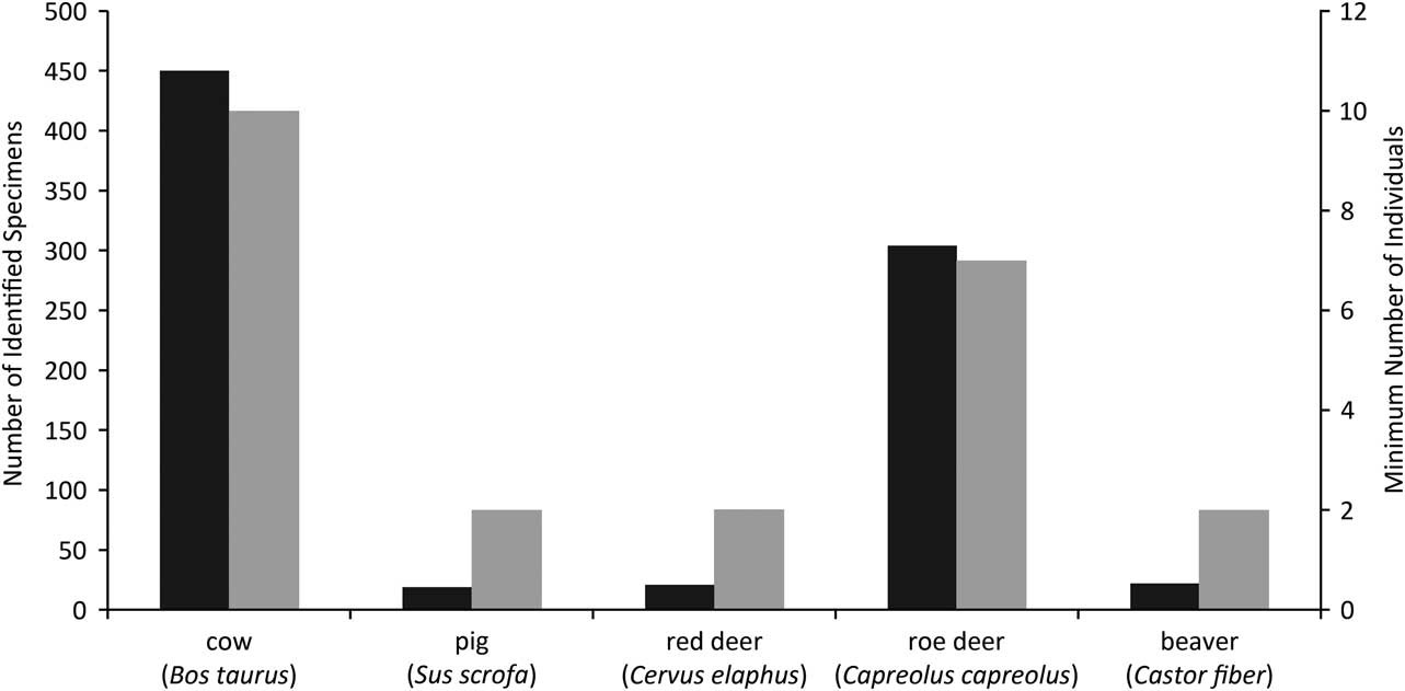 Fig. 3 Coneybury Anomaly zooarchaeological quantification from primary deposits (Maltby Reference Maltby1990), omitting fish. The Number of Identified Specimens (NISP) are in black while the Minimum Number of Individuals (MNI) are in grey