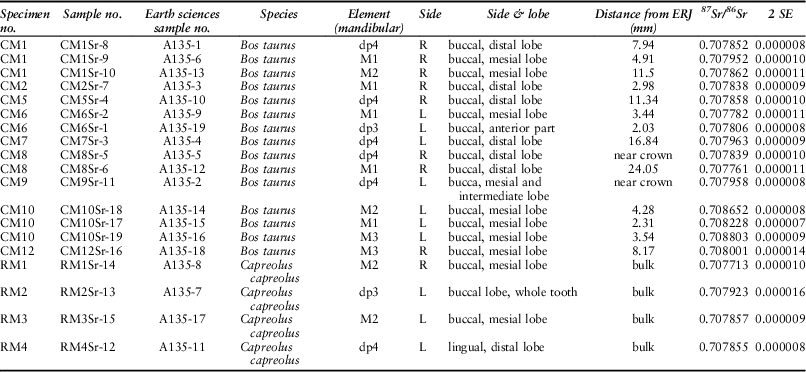 The various isotope systems are derived from different tissues. As discussed above, we sampled mandibles (both species), metacarpals (cattle only), and radii (roe deer only). For the mandibles, strontium was sampled from the enamel of individual teeth, each of which records a discrete period of less than 1 year in the animal’s life when the mineralisation is completed. Sulphur, carbon and nitrogen were sampled from mandibular and postcranial bone collagen, which constantly remodels, so these values are thus averaged over several years. The cattle teeth sampled for strontium represent different stages of enamel formation and maturation (Brown et al. Reference Brown, Christofferson, Massler and Weiss1960), and where possible multiple teeth were sampled from the same individual.