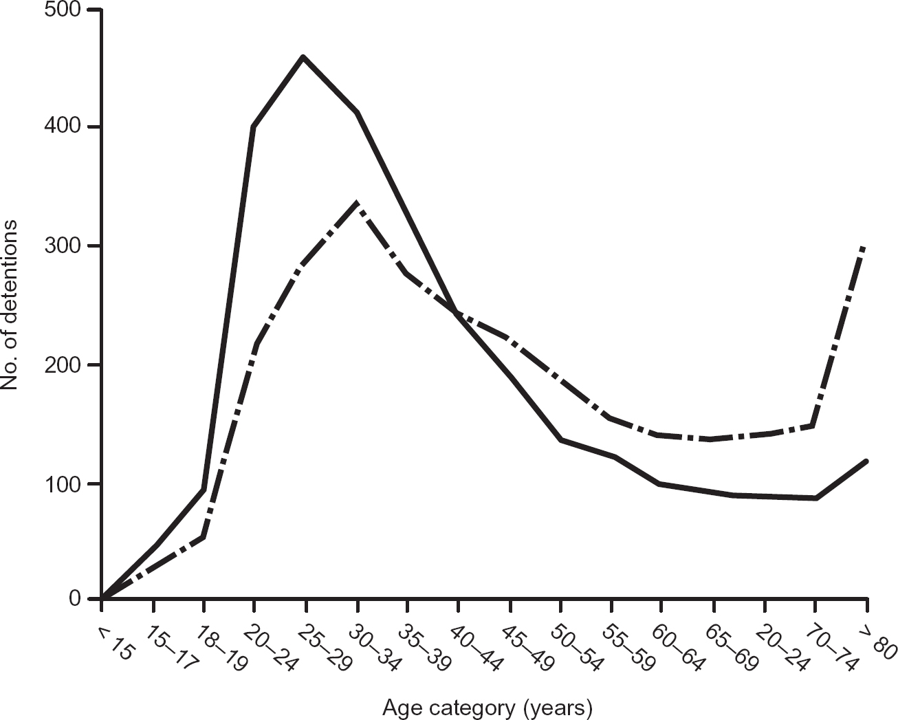 Fig. 1 The number of detentions under Part II of the mental Health Act 1983 per year for men (solid line) and women (broken line) by age group.